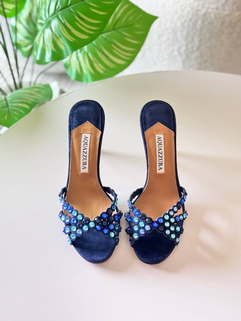 Aquazzura Tequila 75 crystal-embellished mules in light blue
