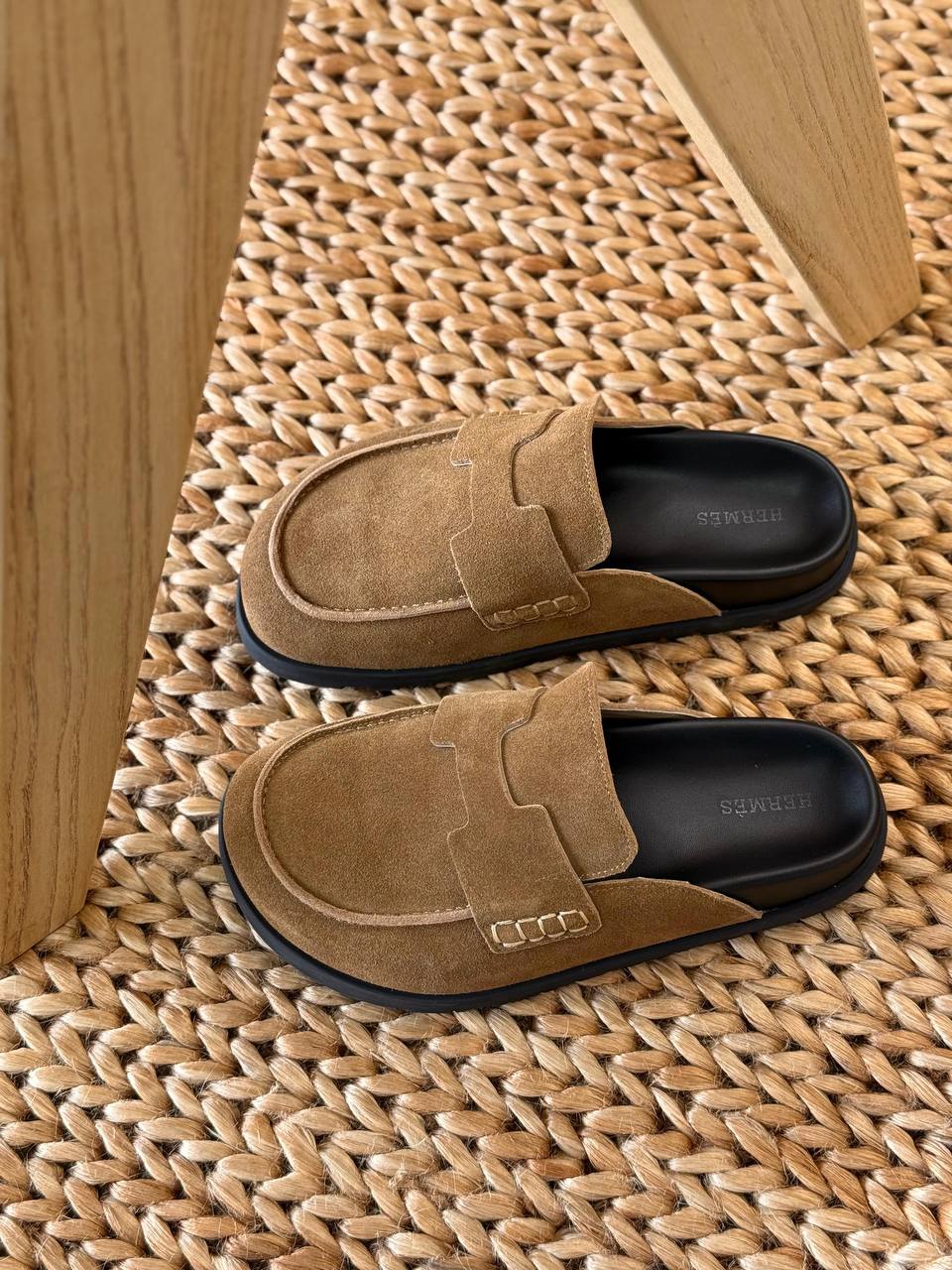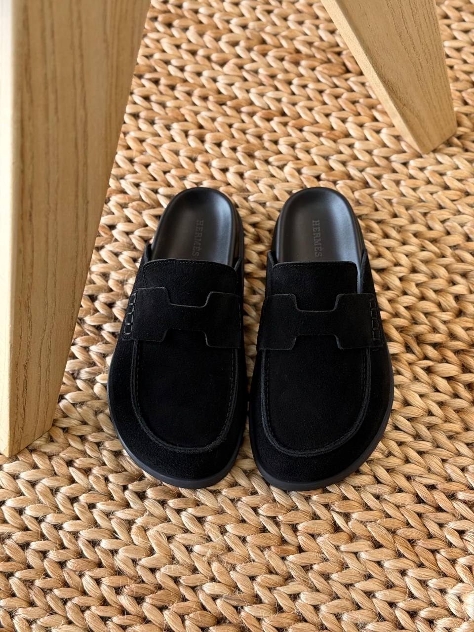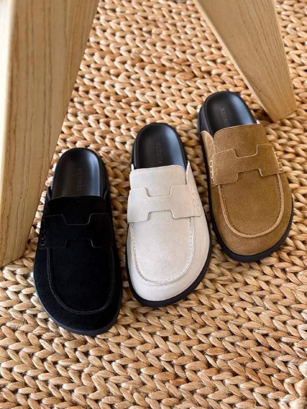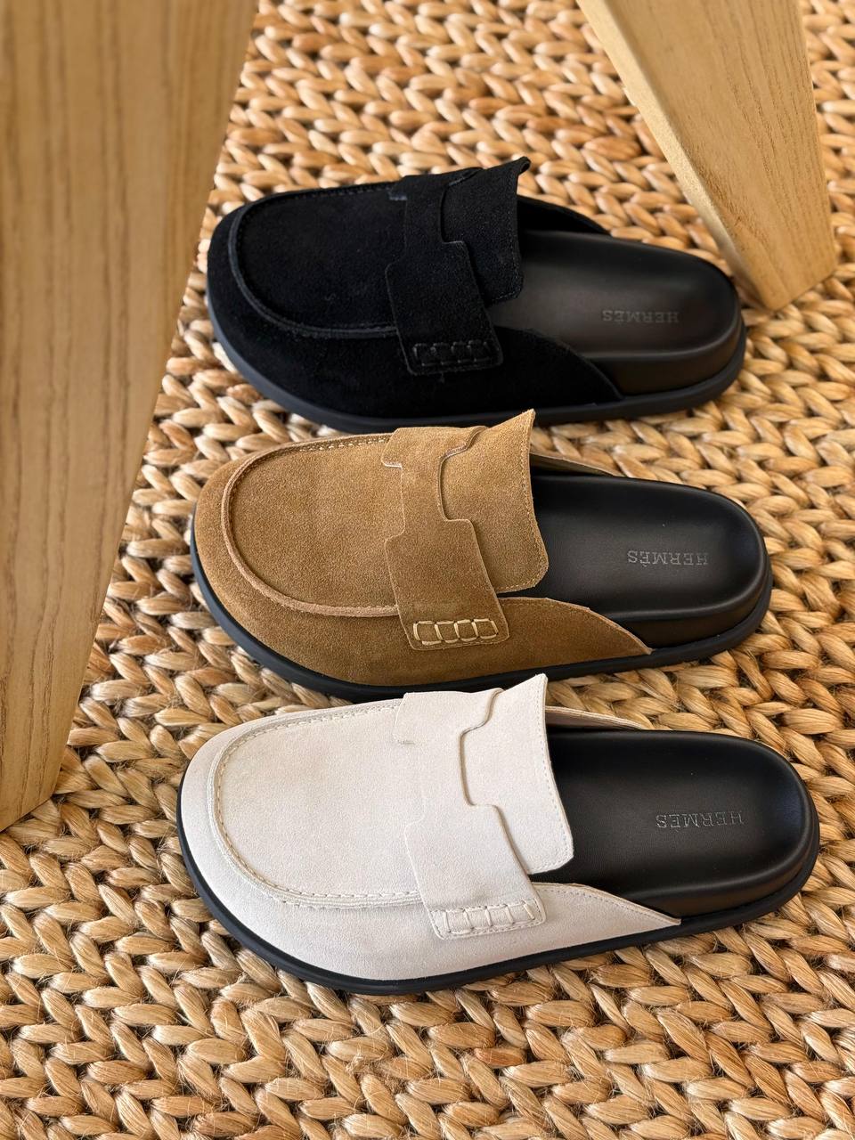 Hermès Go mules in suede calfskin, featuring the iconic “H” cut-out detail, displayed in black, beige sable, and brown color variants.